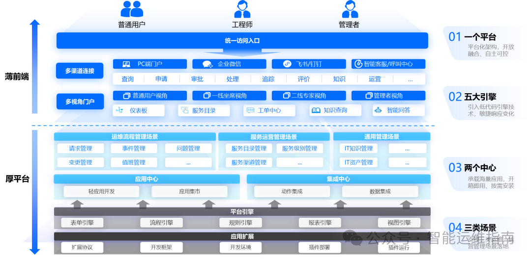 1. 核心定位:超越传统的流程工具,定位为 "厚平台、薄前端"的智能化IT服务管理操作系统。其目标不仅是帮助企业落地ITIL流程,更是通过低代码、自动化和AI技术,为企业构建一个可自主演进、极致灵活的数字化运维基座,驱动IT部门从成本中心向价值中心转型。
