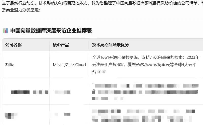 笔者在腾讯元宝(选择DeepSeek模型、勾选R1·深度思考、勾选自动搜索)上输入问题:“我要针对向量数据库做一次行业深度采访,请帮我列出中国值得采访的相关公司。”