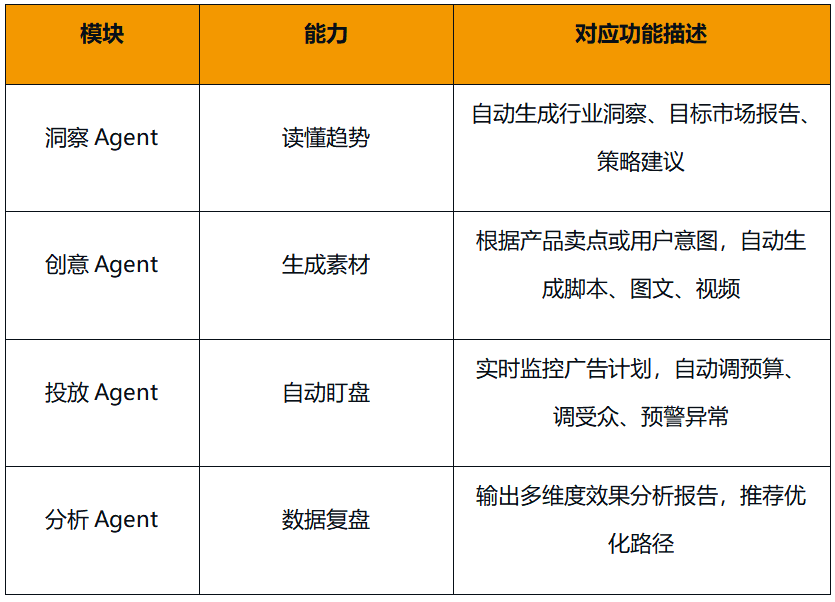 他们需要的是一个“帮忙思考、能自动干活”的AI营销系统,能代替人力完成洞察、创意、执行、分析等重复性工作,让团队回归到真正具备价值的判断、审美与策略。