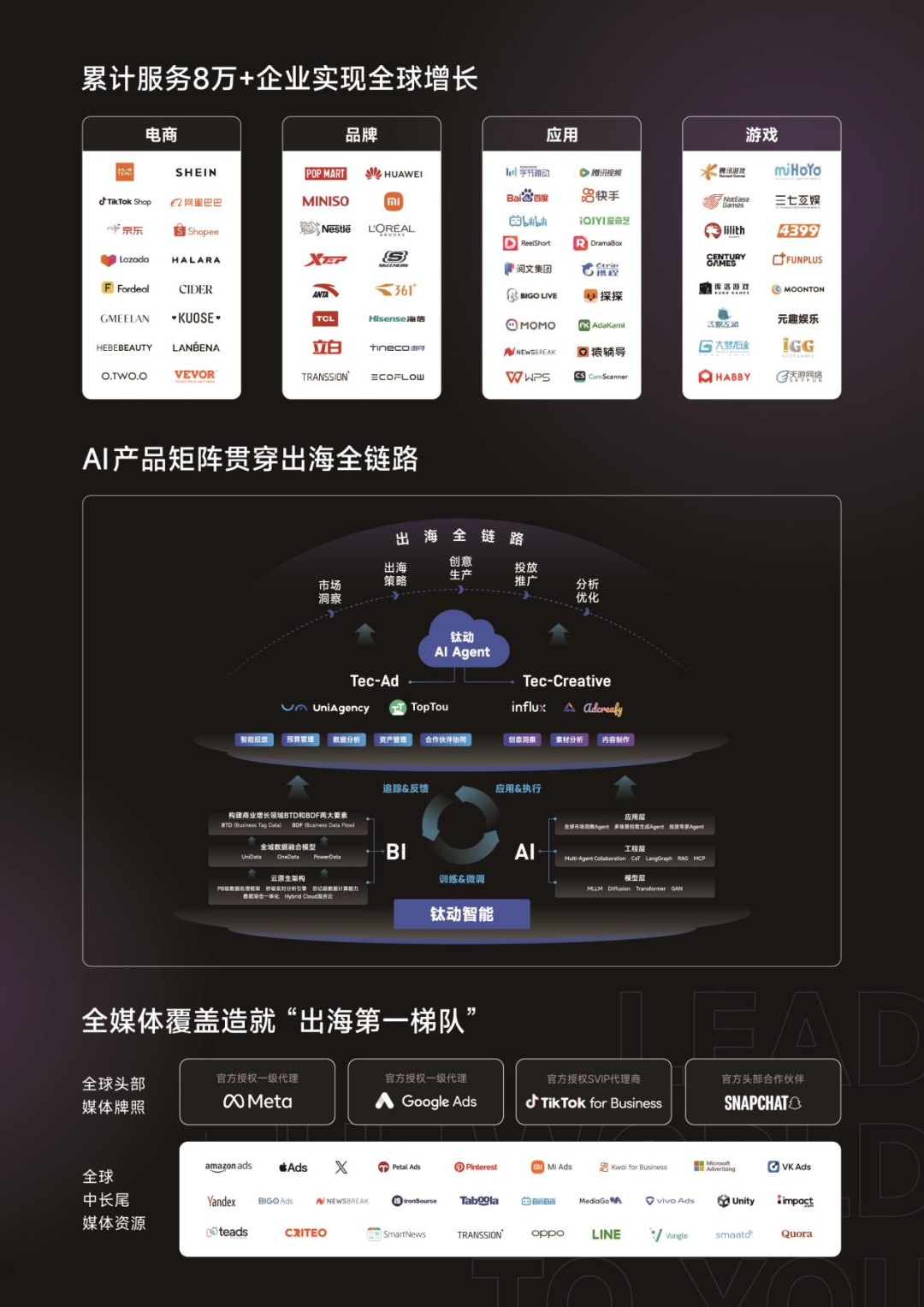 在进入AI Agent时代之前,钛动已经是一家拥有完整SaaS能力的“全球营销基础设施提供商”,为超8万家出海企业提供广告投放、创意制作、内容运营等服务。