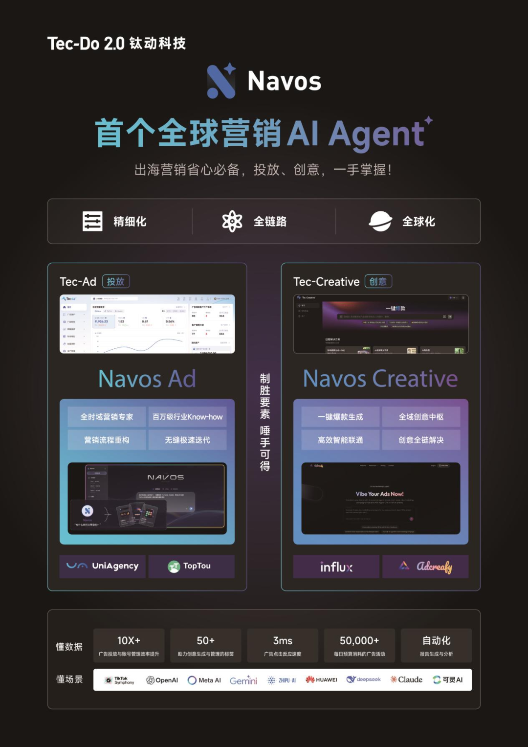 ·SaaS工具链原生整合:Navos不是“外挂型AI”,而是构建在钛动已有Tec-Ad(广告平台)、Tec-Creative(创意引擎)、数据平台等自研系统之上,调用流畅,执行力强。