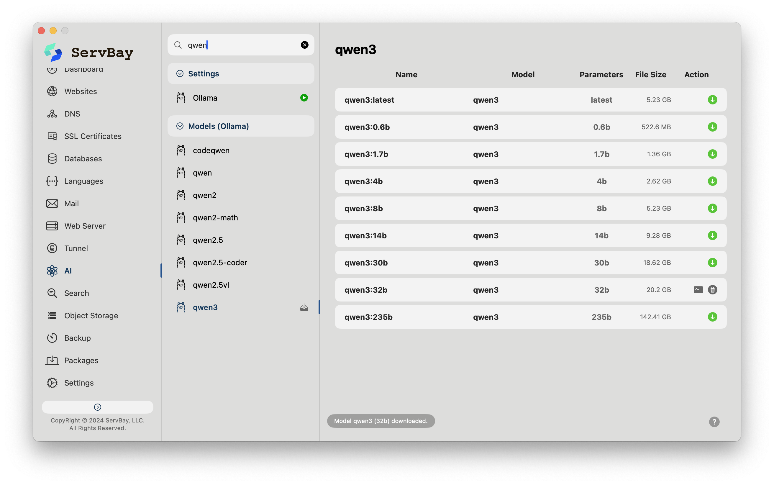 在 ServBay 提供的纯净隔离环境中,我就可以毫无顾忌地运行这些测试,验证代码在特定环境下的行为,为后续的重构打下坚实的基础。此外,ServBay 还支持一键部署本地 AI 功能,这样还能帮我分析那些代码,不然光是阅读那大几十万行代码,三体人来了我都不一定能看得完。