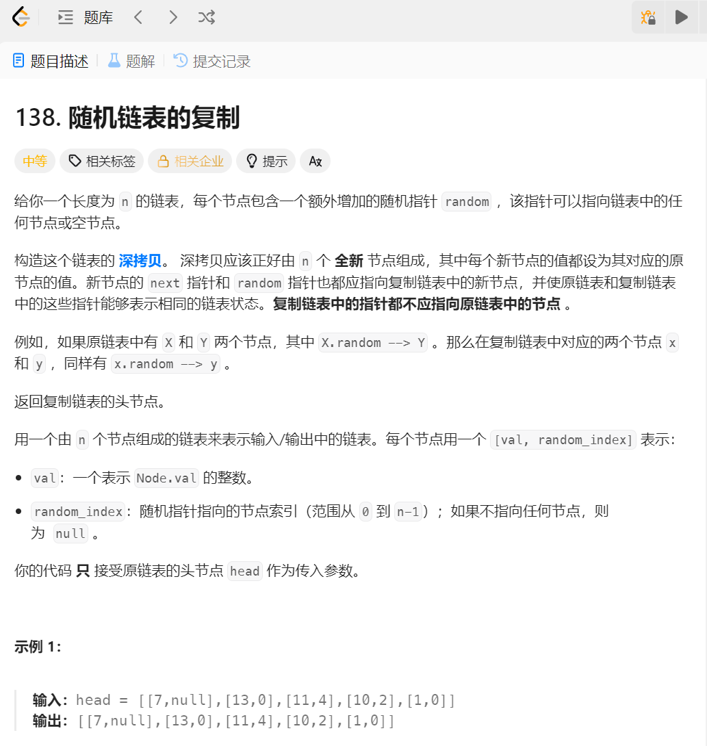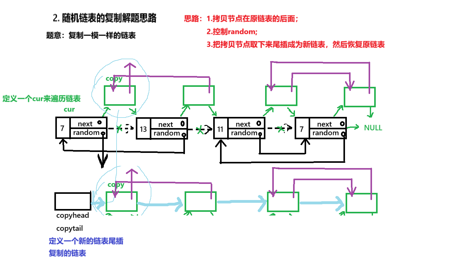 copy->random=cur->random->next;//copy的random指向该原节点random所指向的节点对应的拷贝节点,因为原节点的next就是其对应的拷贝节点