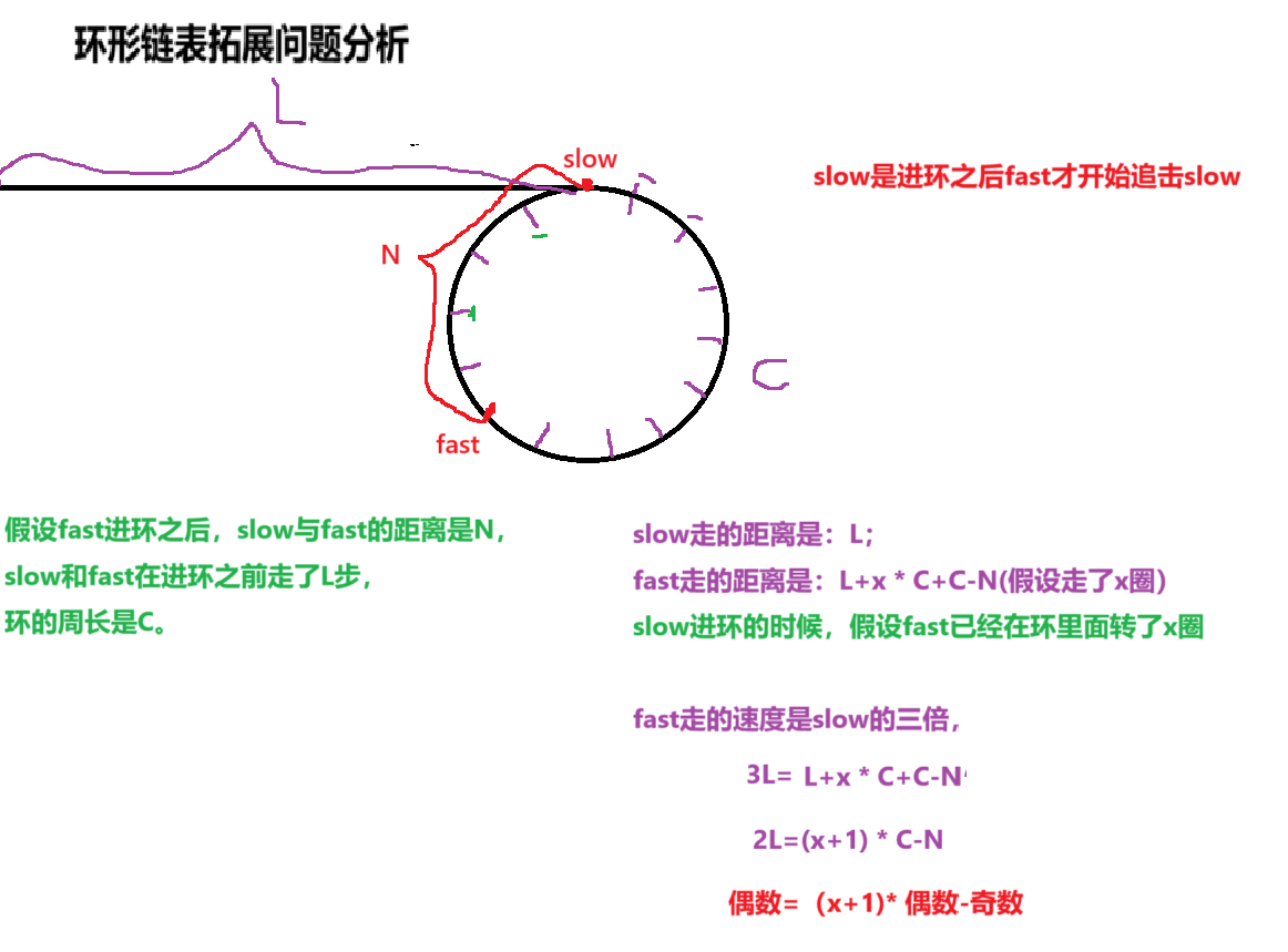 fast走的路程是slow的2倍, 2(L+N)=L+x*C+N 化简:L=x* C-N===>L=(x-1) * C+C-N,x >=1 而且是整数