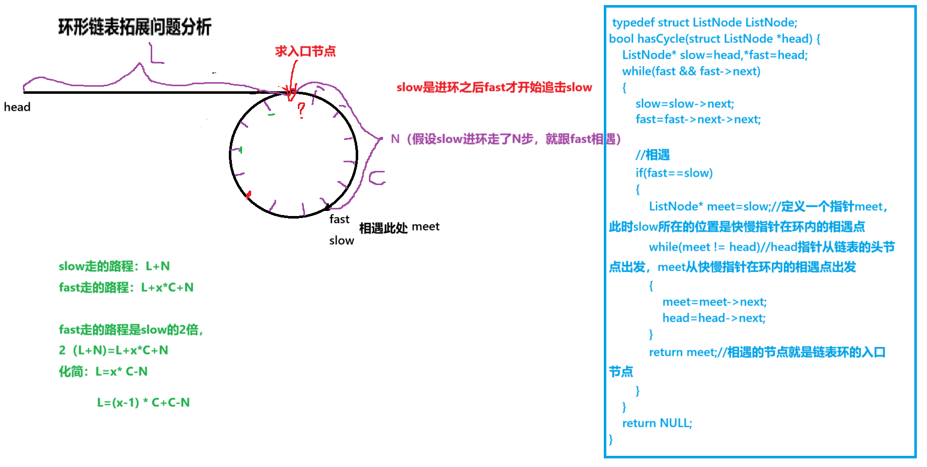 ListNode* meet=slow;//定义一个指针meet,此时slow所在的位置是快慢指针在环内的相遇点