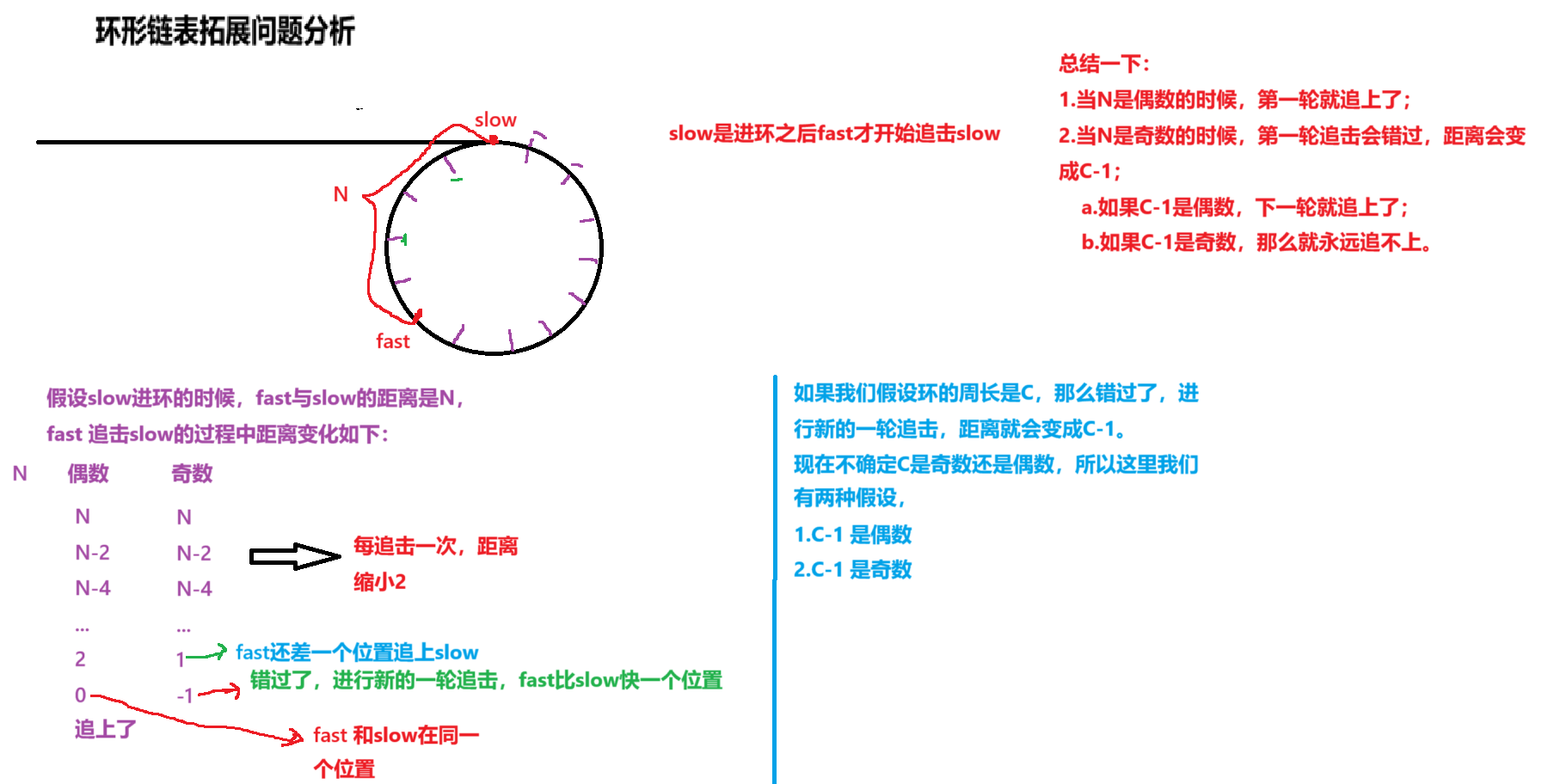 总结一下这个问题,当环的周长为C的时候,当fast 和 slow相差N步,N为偶数的时候,第一轮一定可以追上,但是N为奇数的时候,第一轮追不上,而距离就会变成C-1。