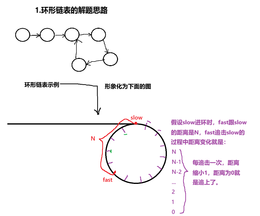slow⼀次走⼀步,fast⼀次⾛2步,fast先进环,假设slow也走完⼊环前的距离,准备进环,此时fast和slow之间的距离为N,接下来的追逐过程中,每追击⼀次,他们之间的距离缩小1步。