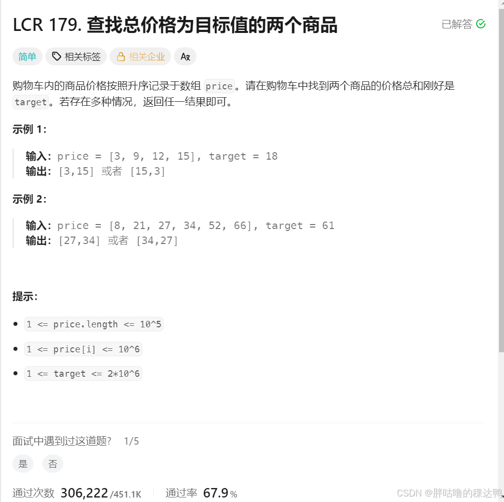 sum>target:说明right太大了,right--;sum<target:说明left太小了,left++;sum=target:返回nums[left],nums[right]但是由于题目中没有给出一整个数组中都找不到两个相加等于target的数,原则上我们已经完成了题目的要求,但是提交代码的时候还会报错,所以要考虑一下编译器,最后我们任意返回两个值,假设编译器没有找到符合条件的值。return{-1,-1};大括号里可以是任意的值。