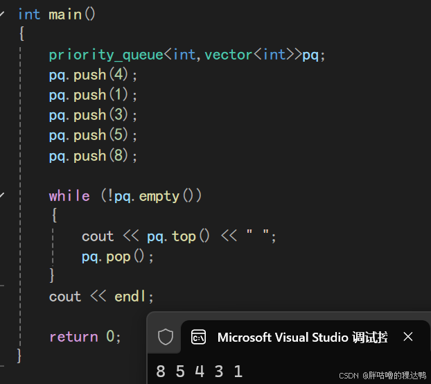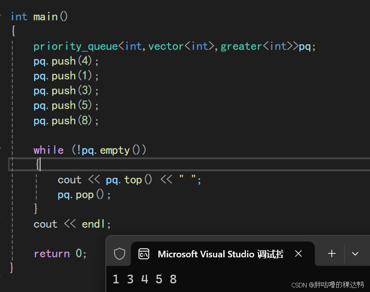 }由此,我们也可以实现一个优先级队列priority_queue的插入与删除,在向上调整AdjustUp和向下调整AdjustDown的实现中我们就完全可以实现大堆和小堆的切换,要实现小堆,不用再AdjustUp和AdjustDown内部进行大于小于号的改变,直接在main主函数中进行说明: