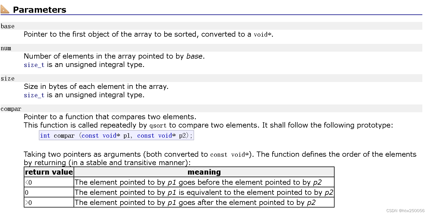 qsort函数最重要的一个参数, int (*compar)(const void*,const void*)),是一个函数指针,指向一个函数,这个函数是我们使用者自己提供的,用来比较这个目标数组中两个元素大小。