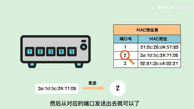 计算机的网卡通过网线连接到交换机的端口上。这个端口就是一个确定的物理位置。我们只要知道某个网卡的mac地址在哪个端口上,我们就能正确的把数据包发给它。所以在交换机中,有一张端口与mac地址的影射关系表,我们称之为mac地址表。交换机维护这张映射关系表。想要与某个mac地址通信时,只需要来查询一下,这个mac地址在哪个端口上,然后从对应的端口发送出去就可以了。