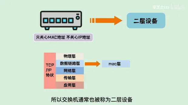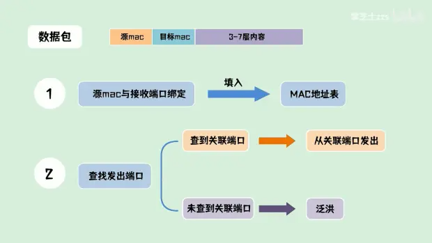 每一包数据都会有两个mac地址,一个是发送方的mac地址成为源mac,另一个是接收方的mac地址称为目标mac,交换机受到一包数据后,首先要把这包数据的源mac与接收端口进行绑定,然后交换机要根据目标mac查找,从哪个端口把数据包发送出去,这时候就会出现两种情况。第一种是mac地址表中查询到了关联的端口,则直接从关联端口发出。第二种情况是mac地址表中没有查询到关联端口。则向除了接收端口之外的所有端口群发,这种行为称之为泛洪,如果目标mac地址在这个网络中则它一定能受到群发的数据包,如此运行一段时间后,通过交换机的mac地址表,就可以找到网络中的所有网卡设备。由此可见,交换机只会关心数据包中的mac地址,而不会关心ip地址,mac地址在TCP/IP协议中处于第二层数据链路层,所以交换机通常也被称为二层设备。