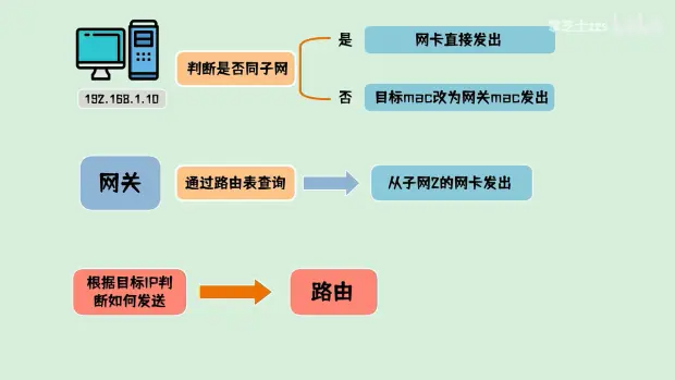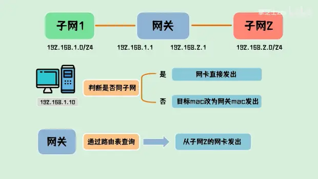 比如:子网1中的计算机A发送数据包时,首先计算机A会根据目标IP判断是否跟自己属于同一个子网。如果是同一个子网则直接从网卡发出。如果不是同一个子网,则需要把数据包的目标mac地址改为网关mac,然后发送给网关。网关拿到这一包数据后再通过路由表查询到这一包数据属于子网2,网关修改目标mac地址为计算机B的mac地址。修改原mac为自己的mac.然后从子网2的网卡发出。