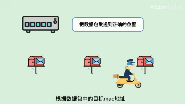 交换机相当于邮递员,根据数据包中的目标mac地址,找到它对应的物理端口。