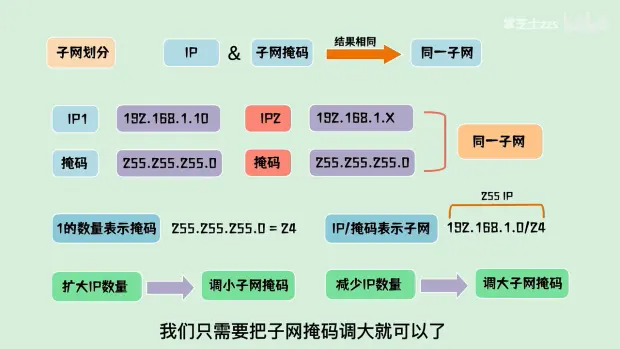 所以如果想扩大子网中IP地址的数量。我们只需要把子网掩码调小,如果想减少网中IP地址的数量,我们只需要把子网掩码调大就可以了。