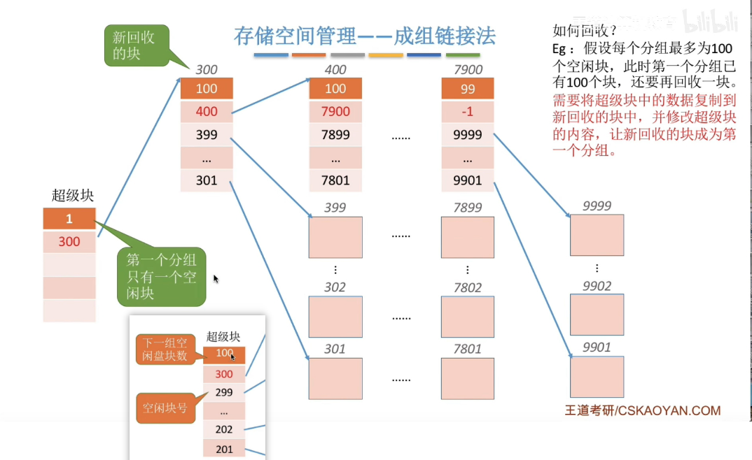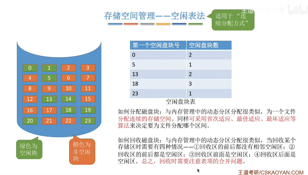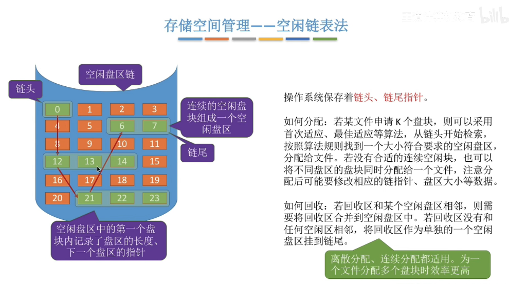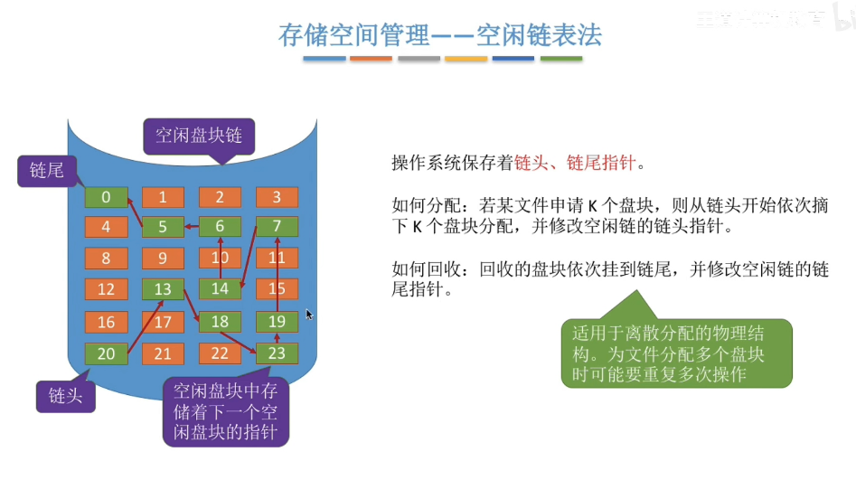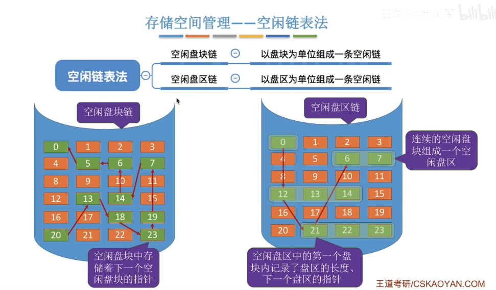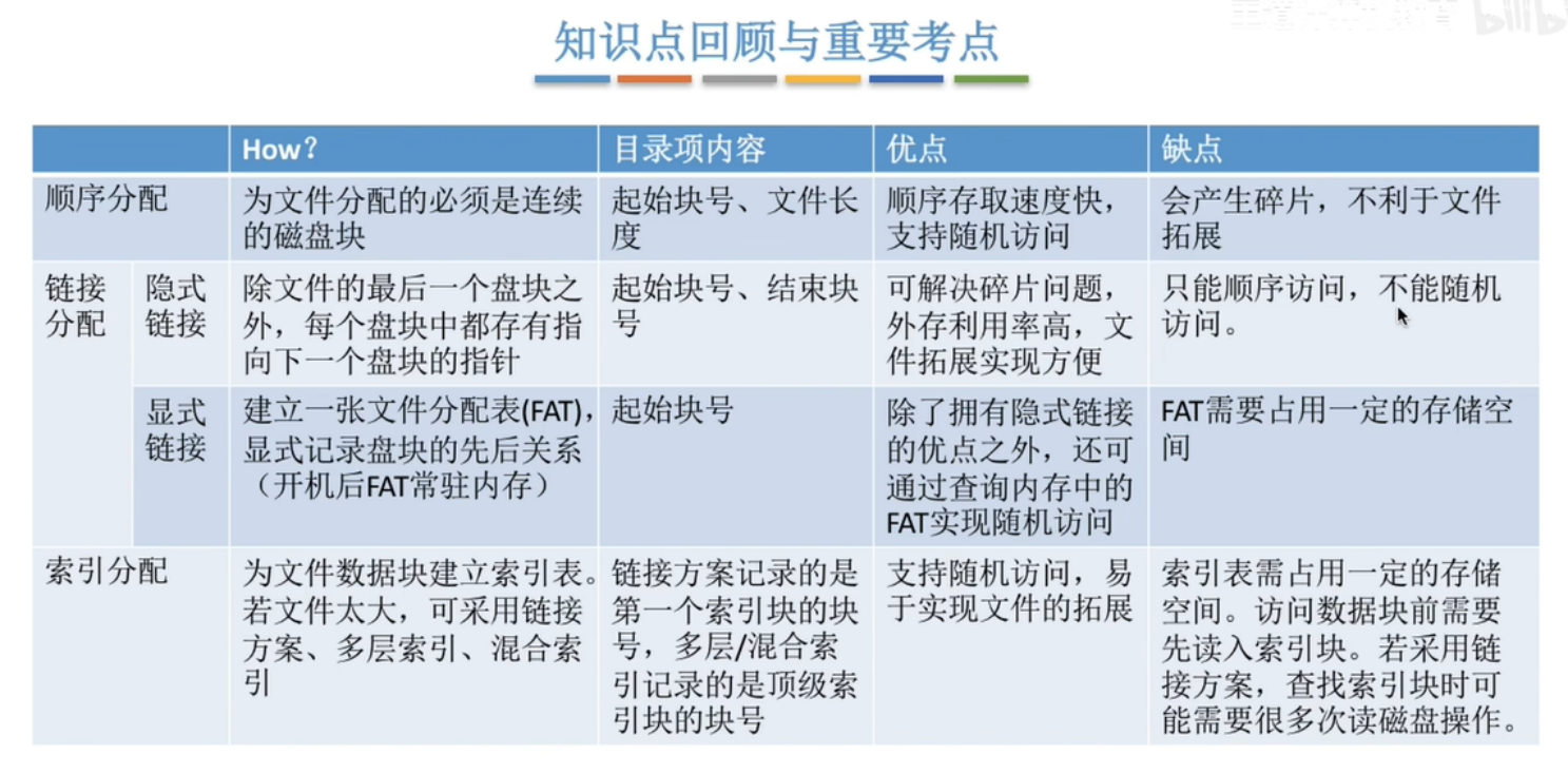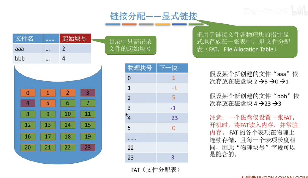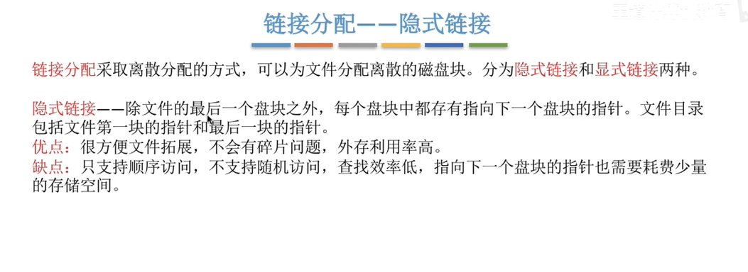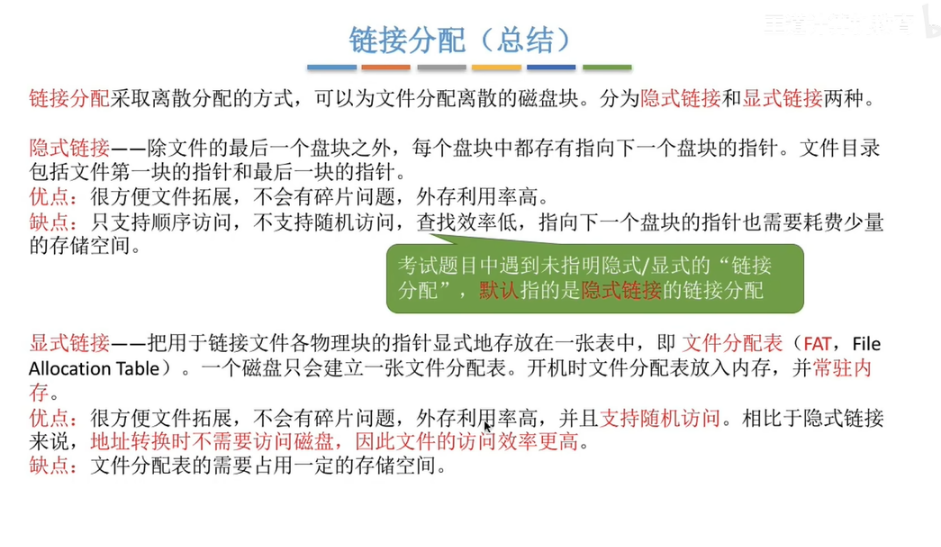 链接分配,隐式,不支持随机查询,但是高效利用存储空间。显式,既支持随机查询,又能高效利用空间,但需要在内存中创建FAT