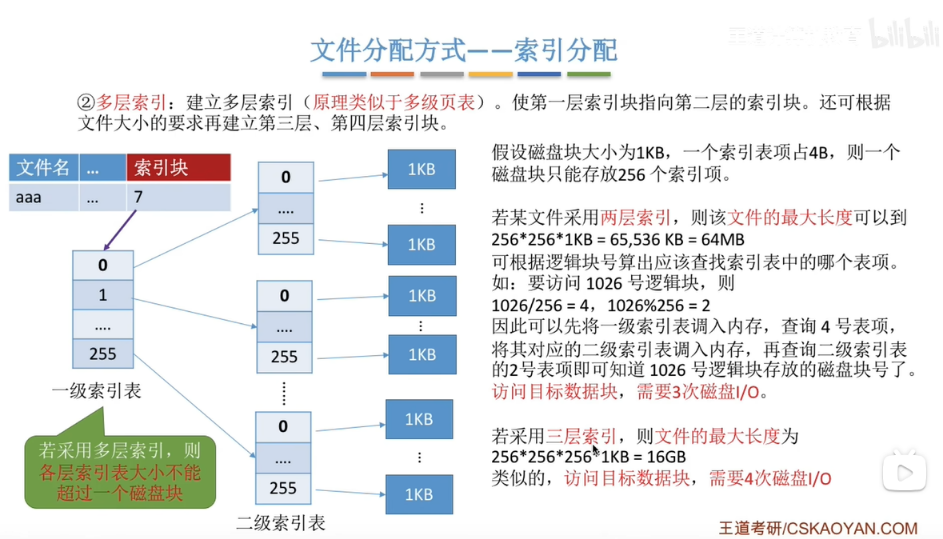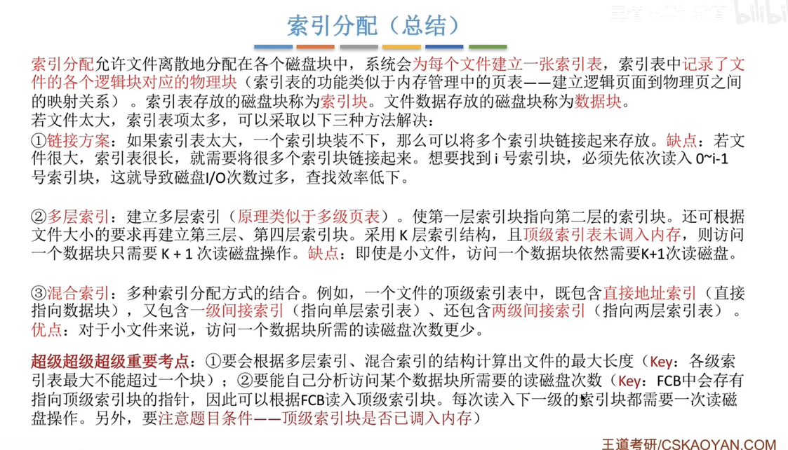 下午 | 学习了连续分配,链接分配,索引分配。其中索引分配又细化为链接索引,多层索引,混合索引。而这些是为了解决文件存储在硬件问题 | |