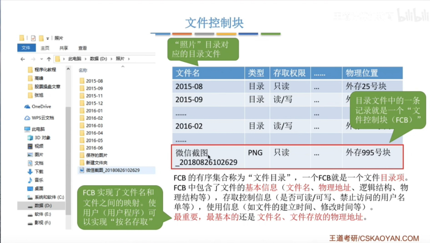 一个文件对应一个FCB、一个FCB就是一个目录项,多个目录项合为一个目录