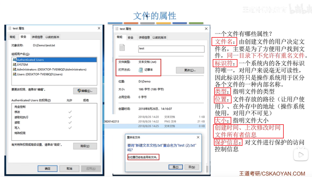 文件名、标志符、类型、位置、大小、创建时间、....保护信息