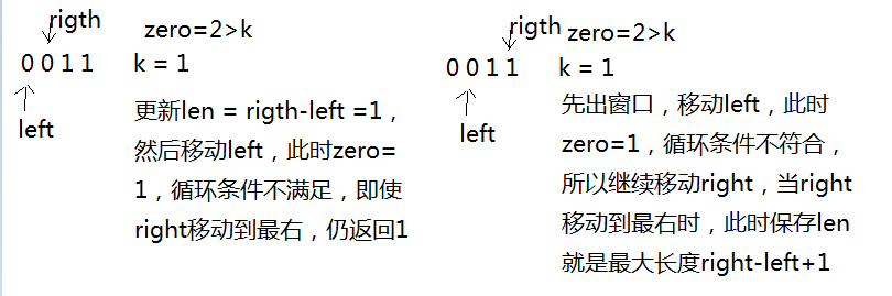 1.双指针:left=0,rigth=0;还有zero计数器。