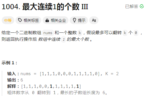 老规矩,根据上面的思路去自己实现代码,链接:1004. 最大连续1的个数 III - 力扣(LeetCode)