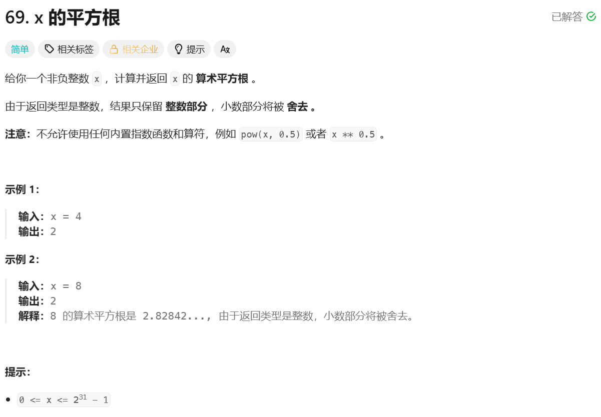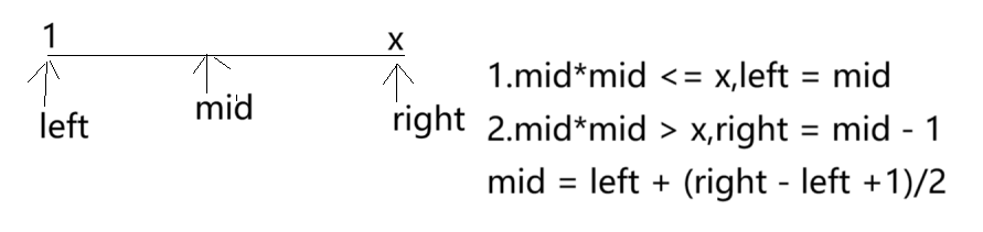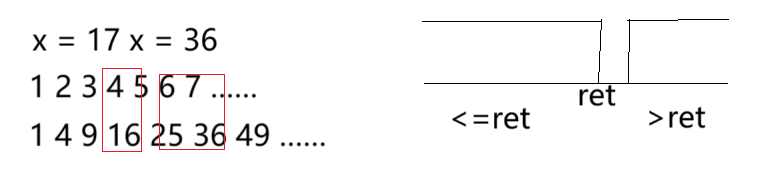 根据举例可以发现,要找的平方根,它的平方数是小于或等于x的,因此我们可以划分出两段区间,由此可以使用二分算法解决问题