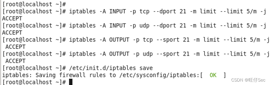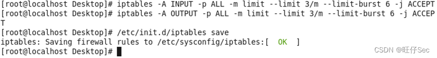 5. 为防御拒绝服务攻击,设置iptables防火墙策略对传入的流量进行过滤,限制每分钟允许三个包传入,并将瞬间流量设置为一次最多处理6个数据包,(超过上限的网络数据包将丢弃不予处理)。