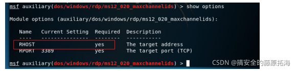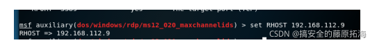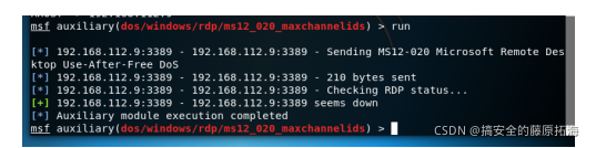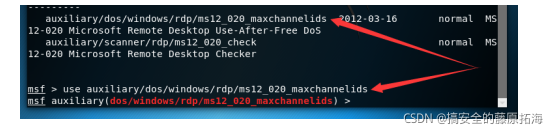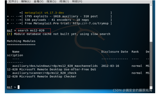 3.打开攻击机的终端输入msfconsole,再输入search ms12-020查找这个模块。
