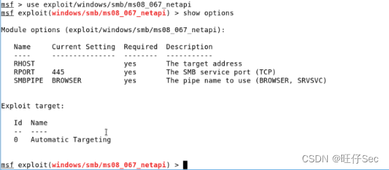 第五步,使用use命令选择exploit/windows/smb/ms08_067_netapi模块来进行利用,然后使用show options命令查看需要设置的参数