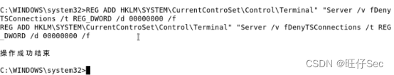 第十二步,使用命令 REG ADD HKLM\SYSTEM\CurrentControlSet\Control\Terminal" "Server /v fDenyTSConnections /t REG_DWORD /d 00000000 /f 开启3389端口: