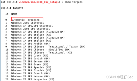 使用show targets命令来显示漏洞溢出模块exploit所支持的目标类型(操作系统、软件版本等)