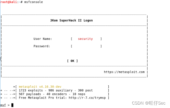 第四步,根据扫描得到的结果靶机的操作系统为WindowsServer2003 SP1 or SP2,通过脚本检测到该操作系统包含命令执行漏洞,漏洞编号为MS08-067,下面我们来通过渗透机中的利用模块来对该漏洞进行利用,通过命令msfconsole来启动metasploit漏洞渗透平台