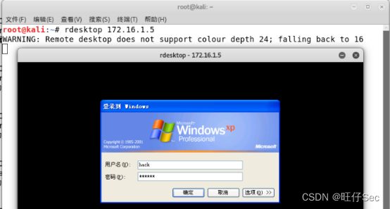 第十三步,使用rdesktop软件来远程目标靶机,输入用户名密码