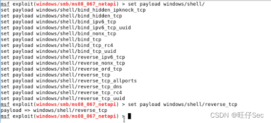 第六步,使用命令set payload 来设置回连至控制端的载荷模块执行操作如下
