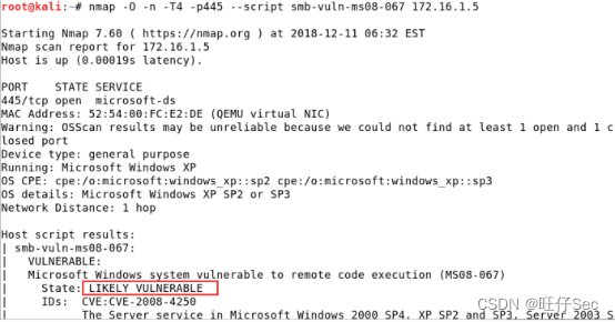 第三步,使用命令nmap -O -n -T4 -p445 --script smb-vuln-ms08-067目标靶机ip 扫描靶机操作系统,同时确认目标靶机是否存在smb漏洞