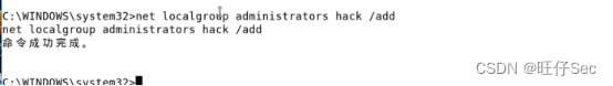 第十一步,使用命令net localgroup administrators 用户名 /add将新用户添加到administrators分组(提升到管理员权限)
