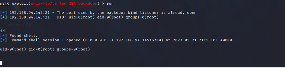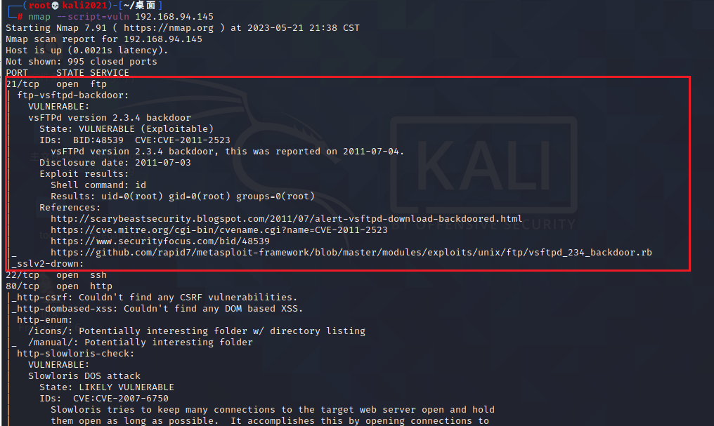然后这里结果显示21端口存在vsftpd2.3.4笑脸漏洞