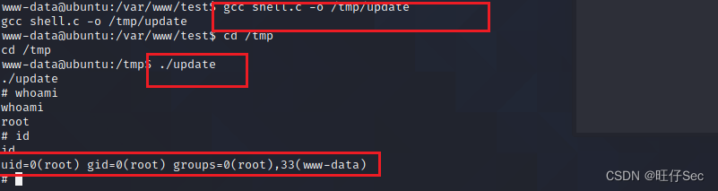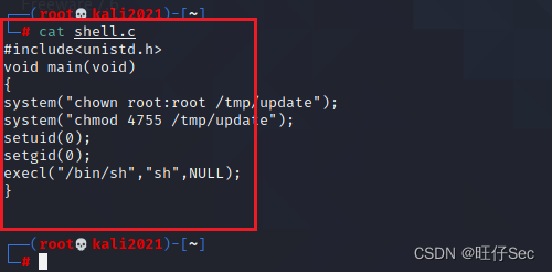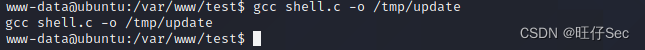 }#这是一段C语言程序的代码,它会将/tmp/update文件的所有者和组更改为root,设置setuid和setgid位为0,然后执行/bin/sh。这段代码的目的是使用/tmp/update文件实现以root权限运行shell的目的。