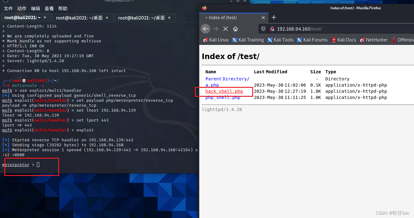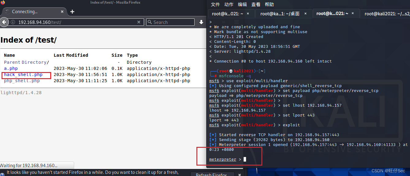 4、然后点击上传的php_shell.php脚本来触发监听获取shell