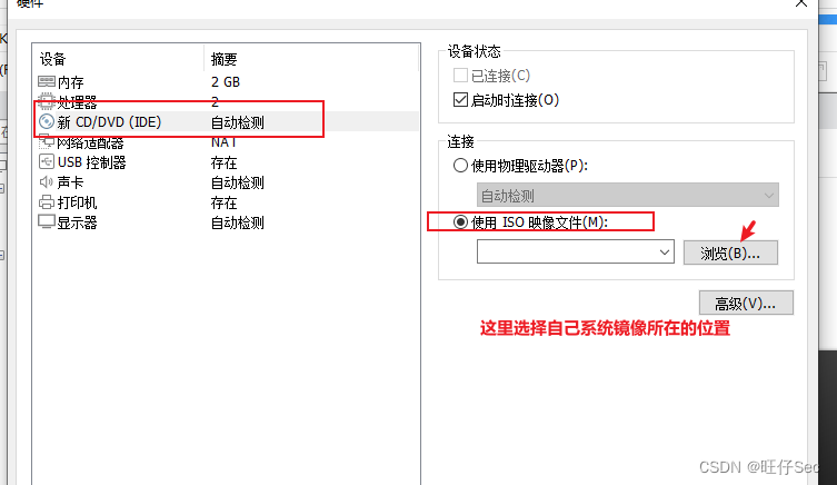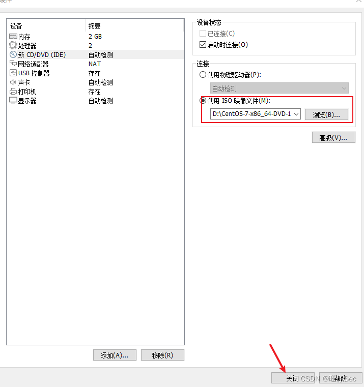 14、点击-新CD/DVD 选项。右边选择-使用ISO镜像文件。添加本地镜像文件。然后点击-关闭