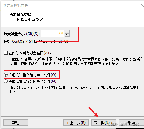 13、这里默认是20G的硬盘大小,我这里因为我需求我就给60G(这个空间大小看自己要干嘛),然后选择虚拟磁盘存储为单个文件,这样就方便管理了!文件也不会乱掉,它自己会将所有的文件存放在一个文件夹当中!