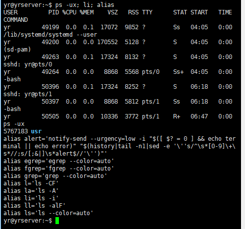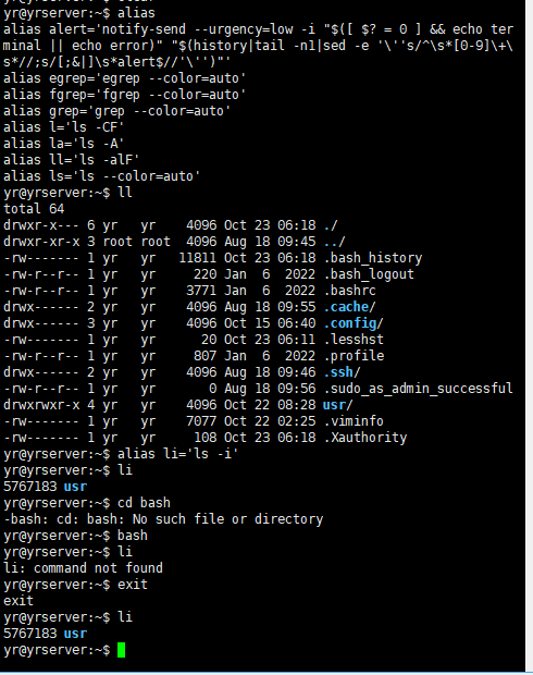 别名只在当前shell生效, 可以看下图, 别名li在子bash里会报comman not found, exit退出后则可以正常执行