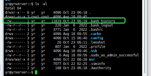 hitsory命令 ---- 显示历史命令列表, 默认展示近1000多条历史命令, 历史命令存储在/home/用户名/.bash_history隐藏文件中