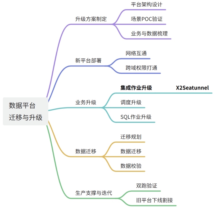 如上思维导图,X2SeaTunnel 的场景源于数据平台的迁移与升级,数据平台迁移升级到湖仓一体平台往往会经历很多步骤,有很多细节。