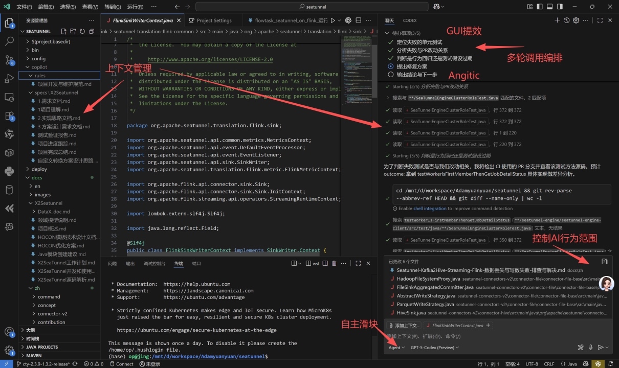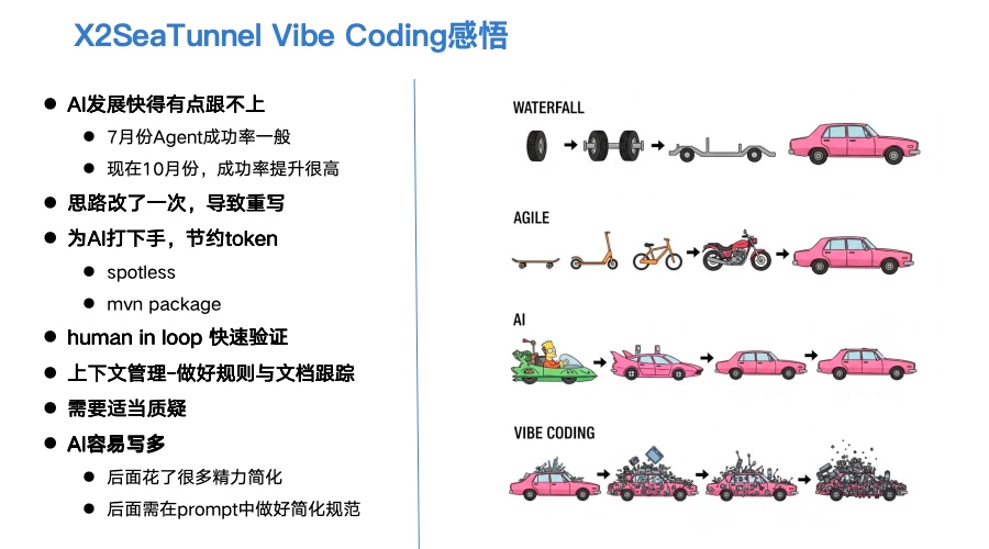 X2SeaTunnel 相对比较解耦,对生产不会有太大影响,并且可以很快验证效果,比较适合 AI Coding。所以我一开始从架构设计,到代码开发再到落地交付,都是 AI 参与的,代码几乎全是 AI Coding的。(记录时间非常重要,实现代码的时候,是 2025 年 6 月,当下 AI 的发展是每个月一变,到现在 2025 年 10 月,AI Agent 模式已经可以覆盖更加底层,更加复杂的需求了。)