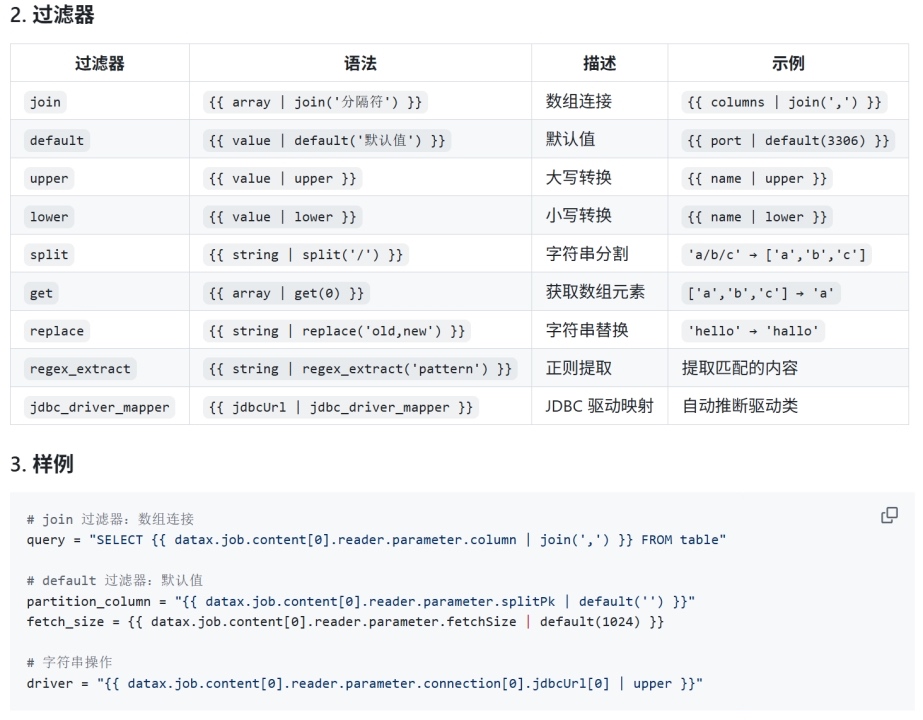 模版系统应该使用比较通用的语法,一开始选择的是SeaTunnel的HOCON语法,后面为了更多的表达力,选择了兼容Jinja2 风格的模板语法,具体见文档。