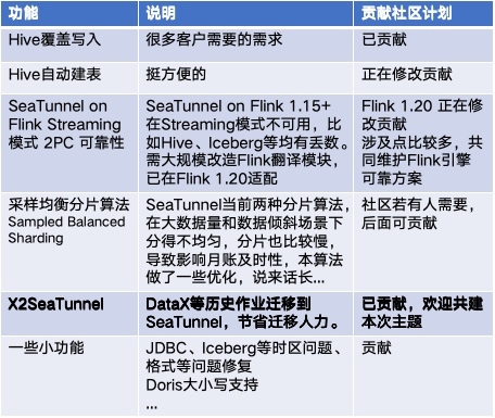 同时,我们也会将在场景下发现的 bug、设计的 feature 等逐步反馈给开源社区,共建共赢。比如 Hive 覆盖写入,Hive 自动建表等客户常见需求,Flink 1.20 支持,X2SeaTunnel,SBS 数据分片算法等新特性,已经或计划贡献到 Apache SeaTunnel 社区。